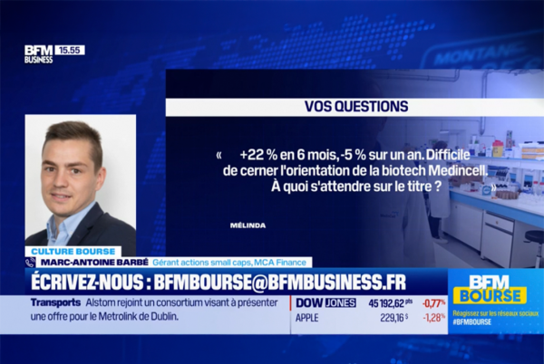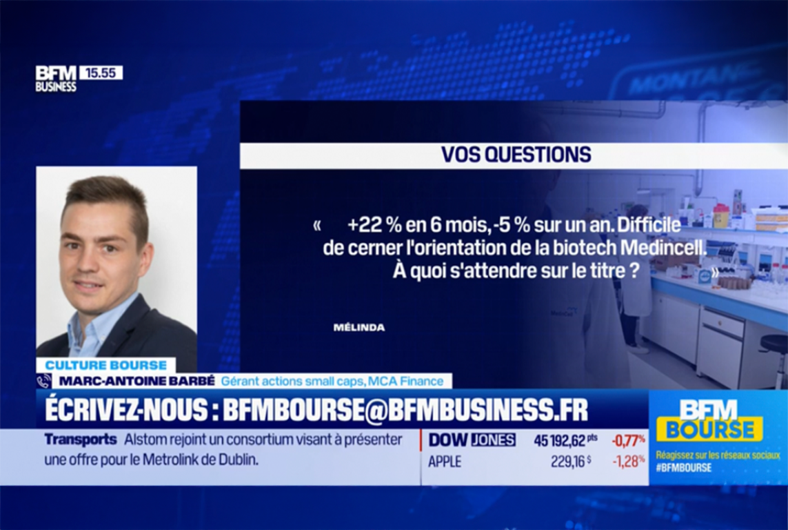 Lien vers l'interview BFM TV : "+ 22% en 6 mois, - 5% sur un an. Difficile de cerner l'orientation de la biotech Medincell. À quoi s'attendre sur le titre ?" 02/09