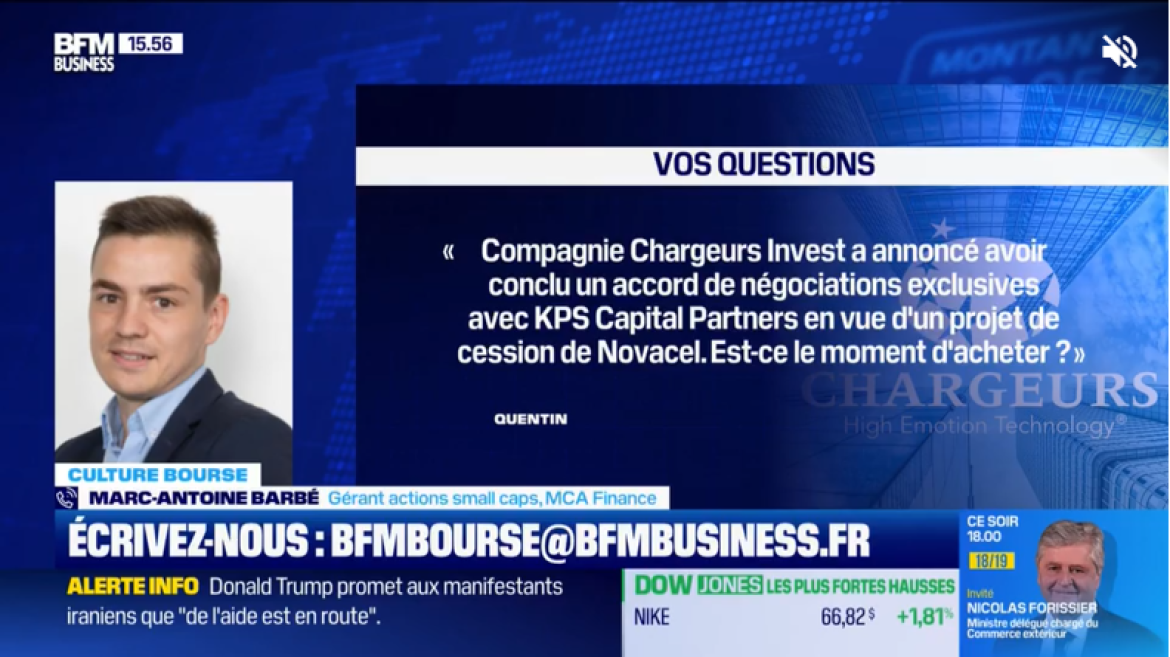 Mardi 13 janvier, Marc-Antoine Barbé, gérant actions small caps chez MCA FINANCE, a répondu à la question "Compagnie Chargeurs Invest a annoncé avoir conclu un accord de négociations exclusives avec KPS Capital Partners en vue d'un projet de cession de Novacel. Est-ce le moment d'acheter ?" dans la chronique Culture Bourse